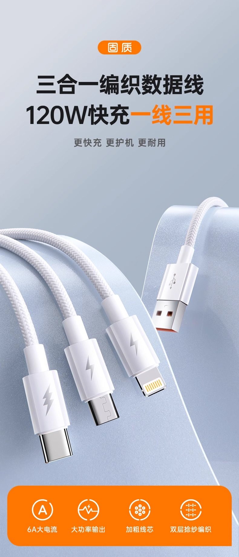 1.0米【快充套装】雅灰白三合一+QC3.0快充头