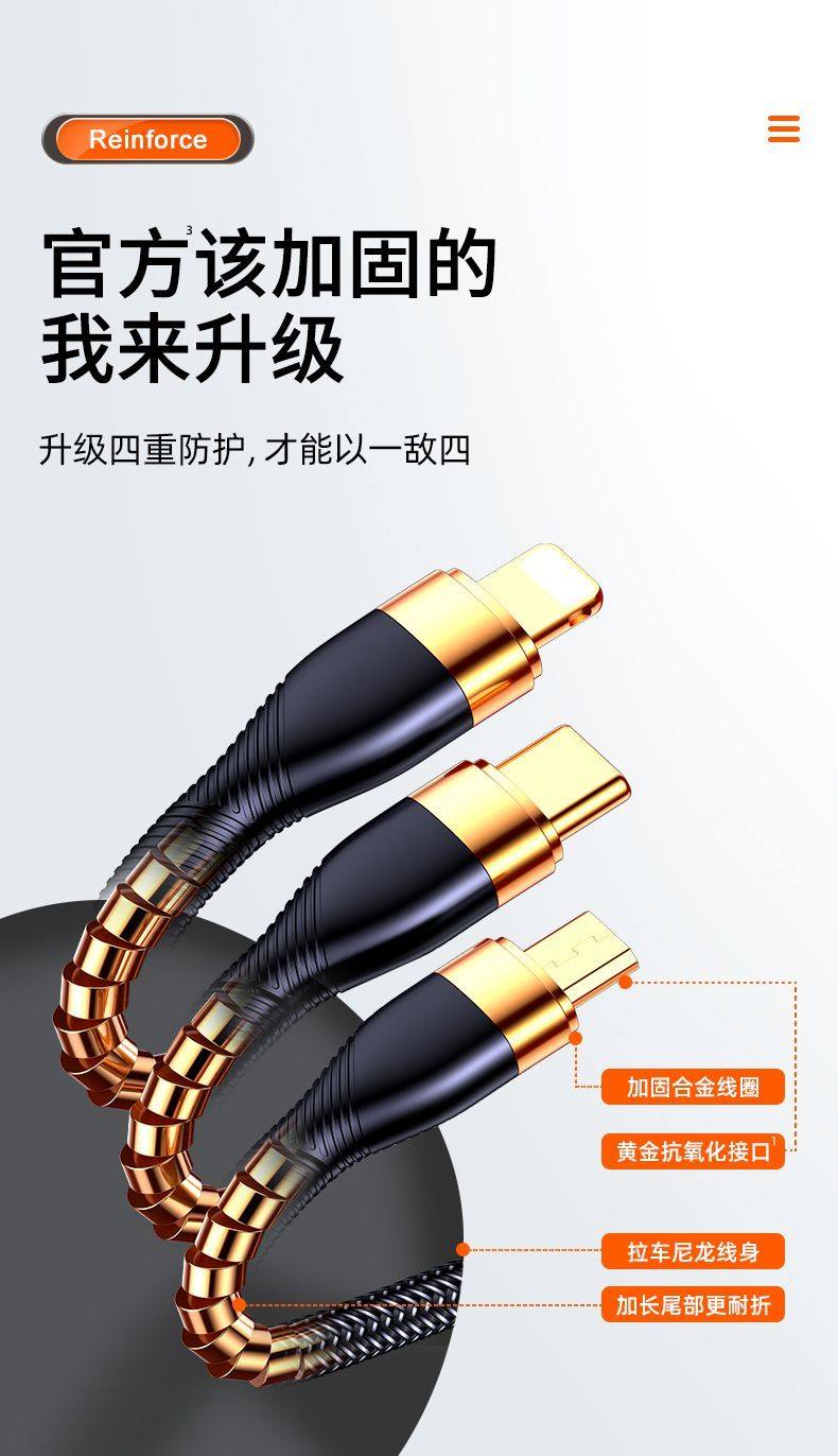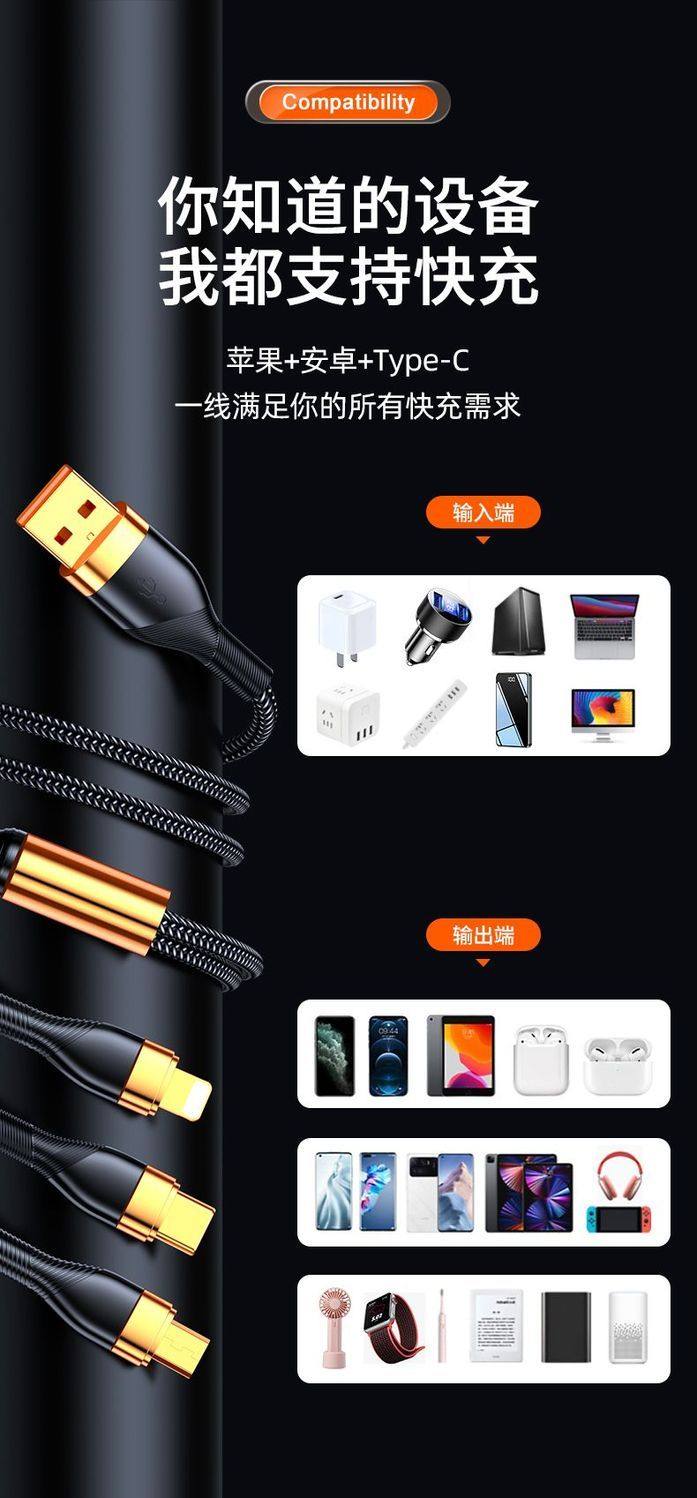 商品名称:240w快充数据线三合一手机充电线一拖三正品适用于安卓苹果iphone华为小米vivo闪充车载三头多功能接口三线