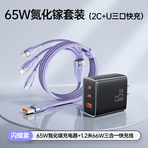 苹果6-16◆氮化镓快充套装★65W氮化镓充电器+闪蝶紫1.2米66W三合一快充线