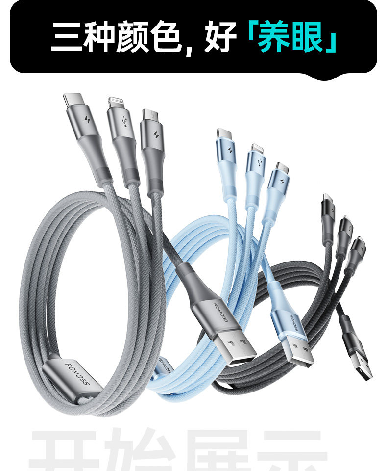 商品名称:罗马仕数据线三合一充电线器头一拖三快充车载三头适用苹果16华为Typec安卓多头多功能66W手机iPhone15通用