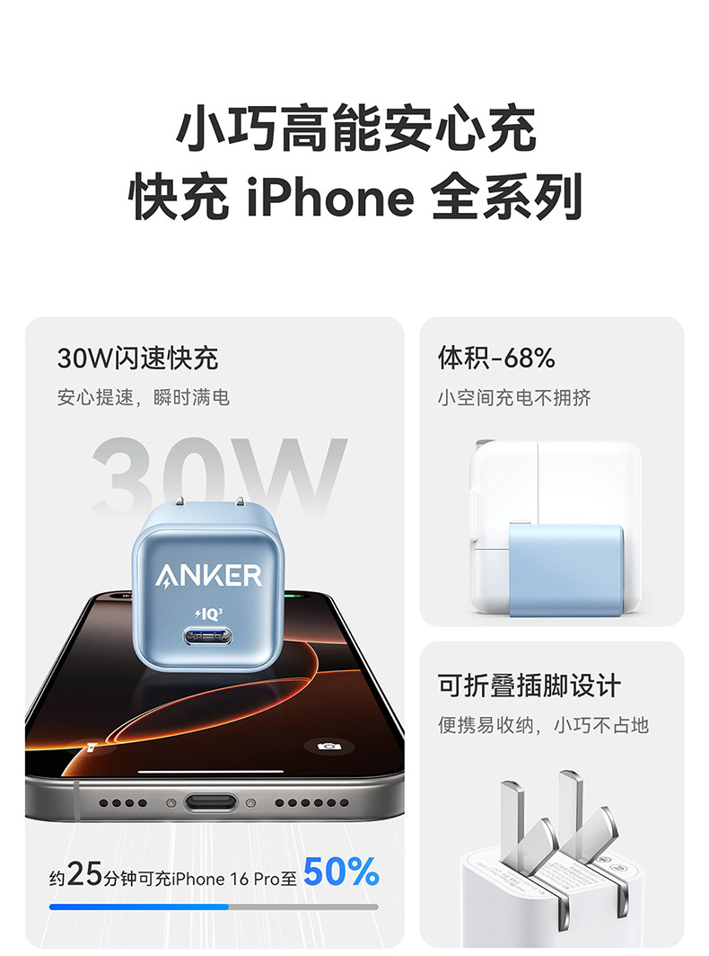 商品名称:Anker安克安心充适用苹果充电器iPhone16安克原装充电头16ProMax30W快充15插头14Pro手机16plus套装45W数据线