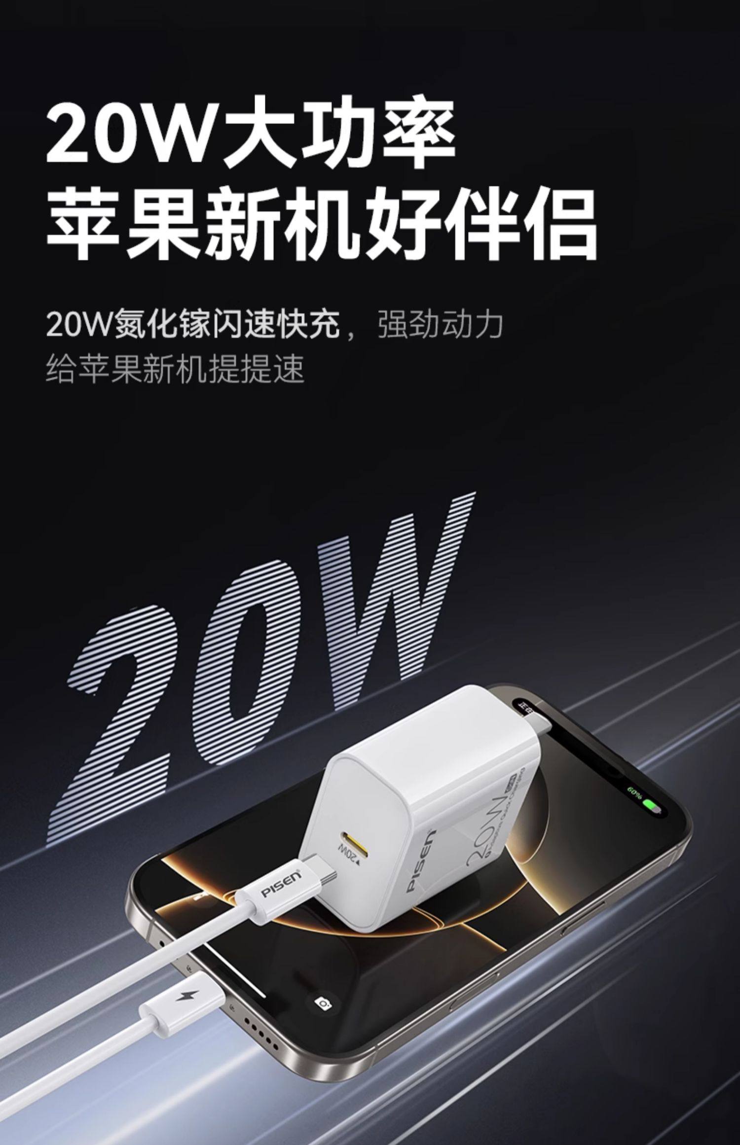 商品名称:品胜充电头适用苹果iPhone16充电器头15快充14pro套装typec插头30W氮化镓13手机11数据线20w充电器线pd正品12