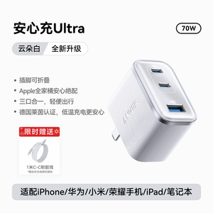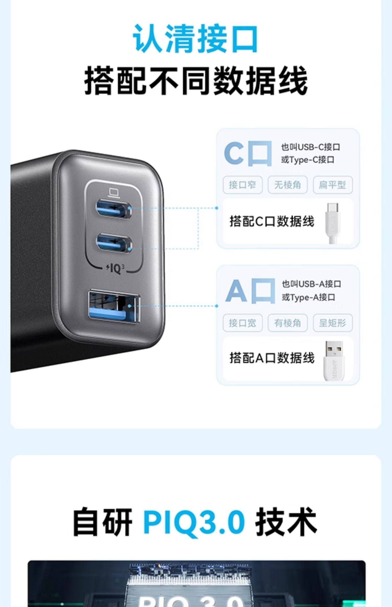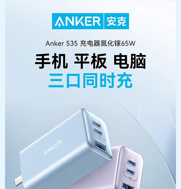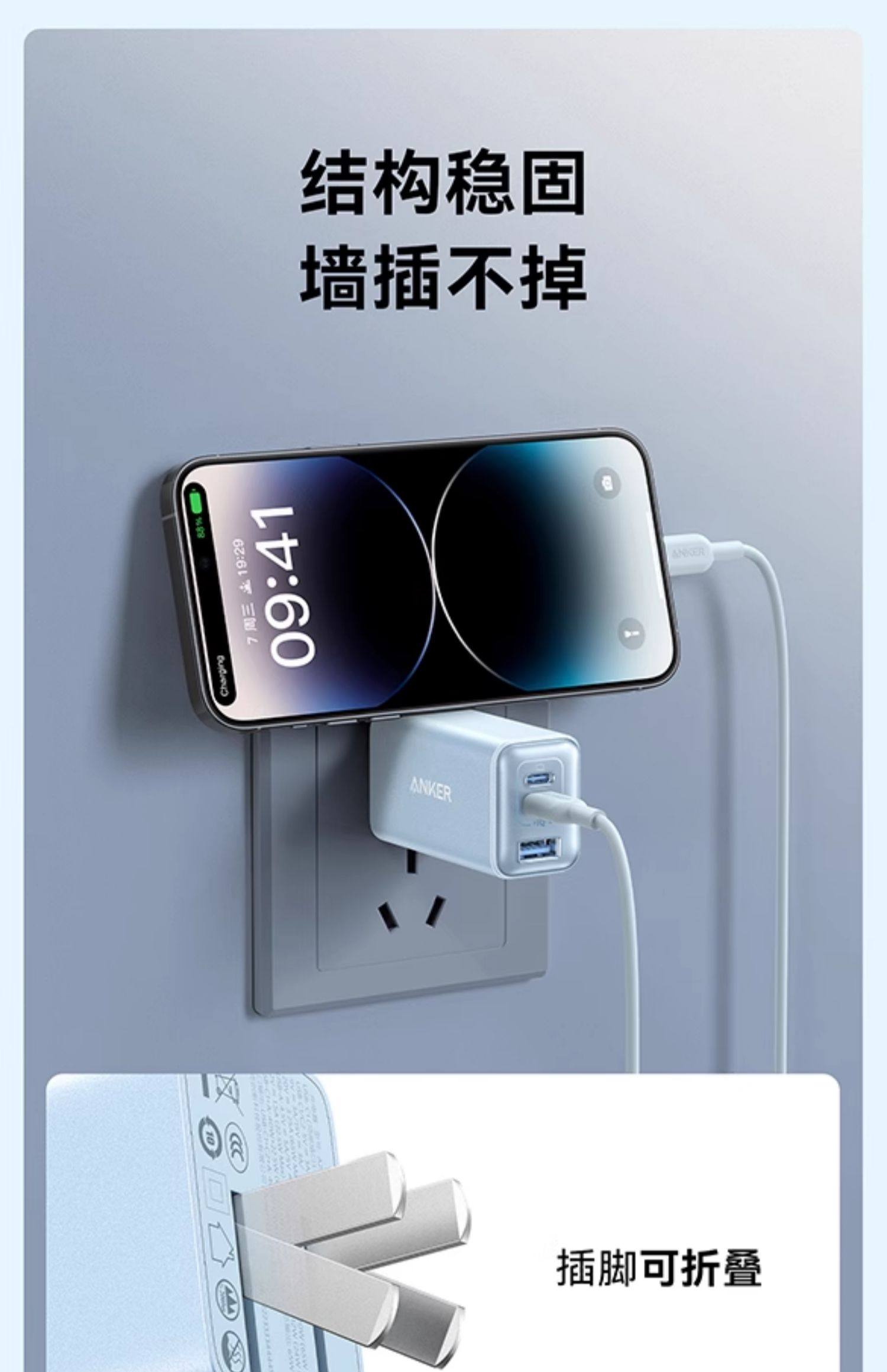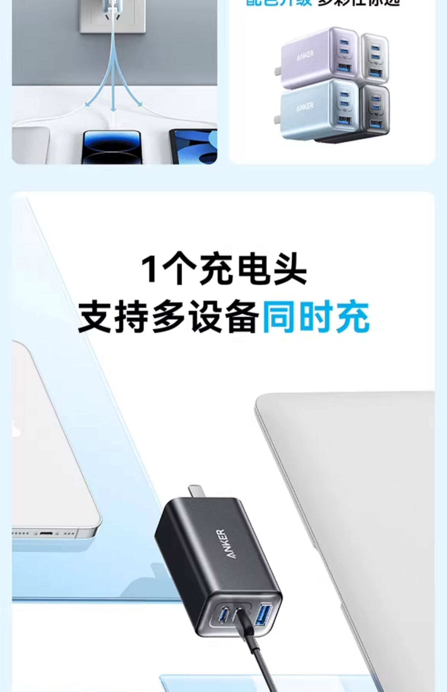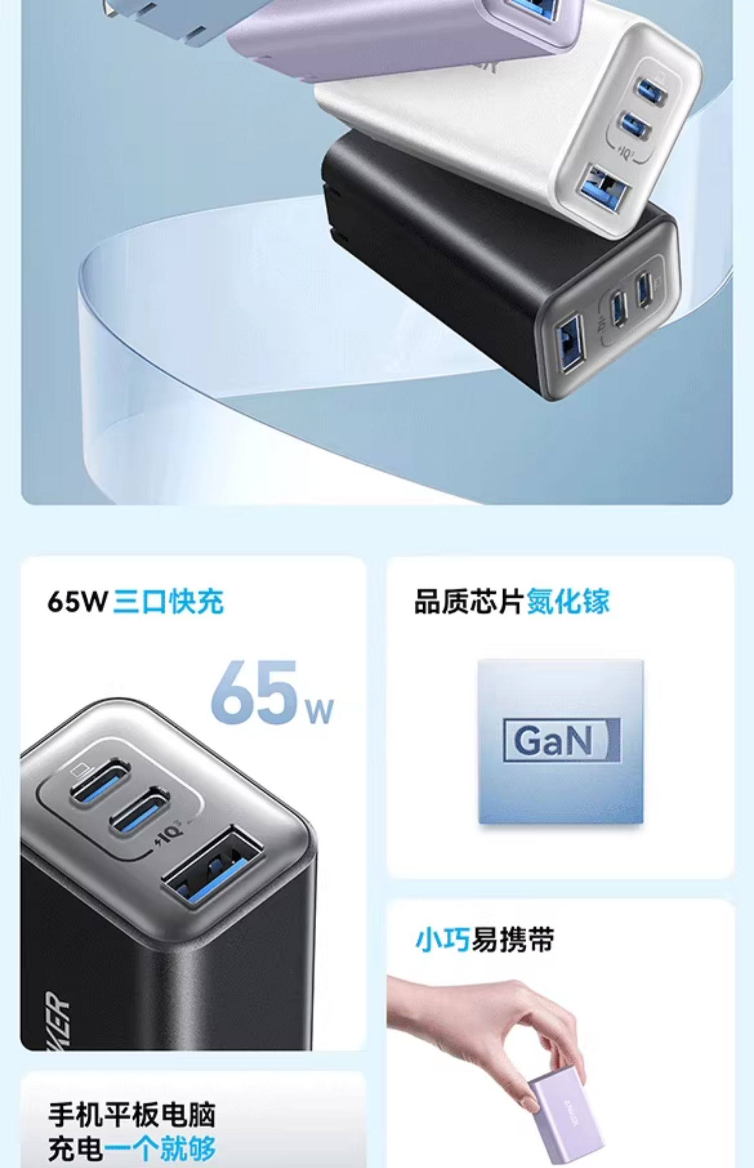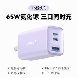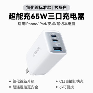 Anker安克65W氮化镓充电器快充充电头PD适用平板iPhone15pro苹果16手机iPhone16macbook笔记本电脑插多口45W